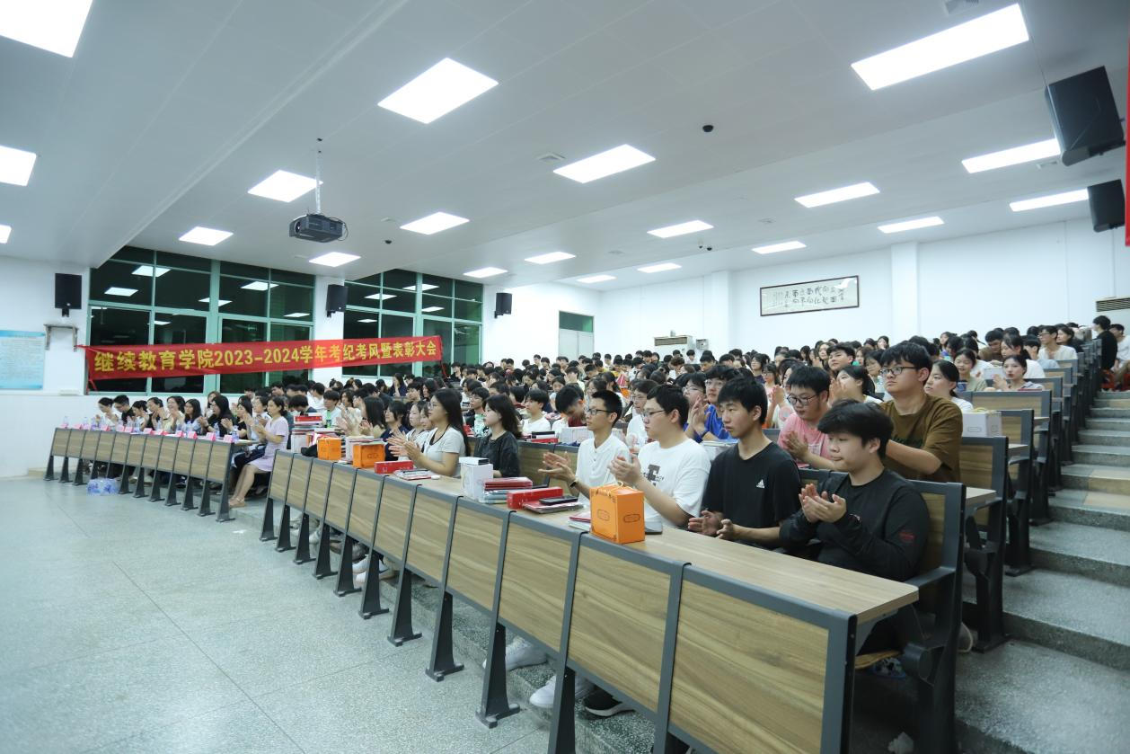 2024年6月25日下午,我院在6栋教学楼401课室召开2023-2024学年考纪考风暨表彰大会。91九色精品人妻詹鑫副书记、谢飞玲老师、自考项目全体老师以及300余名学生参加会议。
